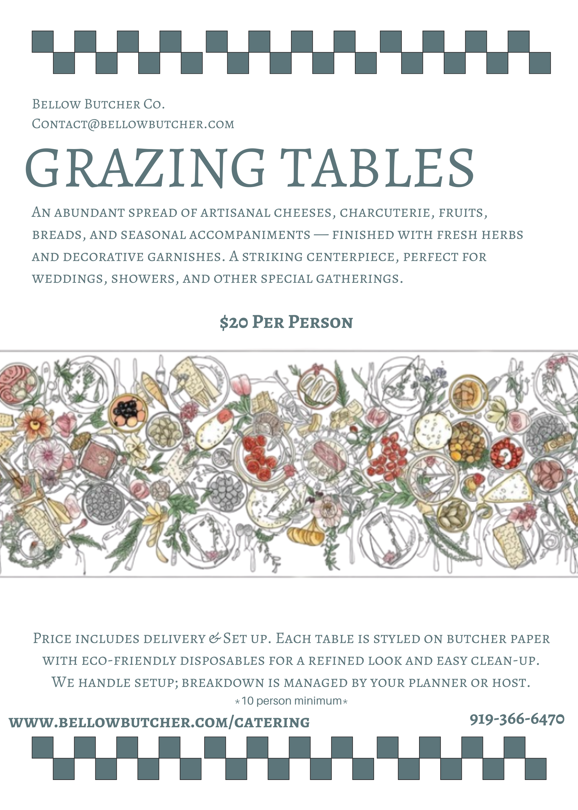 Our Grazing Tables are an artfully styled, show-stopping way to feed a crowd and are perfect for gatherings, weddings, showers, and celebrations of all kinds. Each table is thoughtfully composed using 100% disposable materials for a clean, seamless presentation. Delivery and on-site setup are included, and the table is designed for easy host-managed breakdown once the event wraps. Beautiful, generous, and intentionally low-stress.