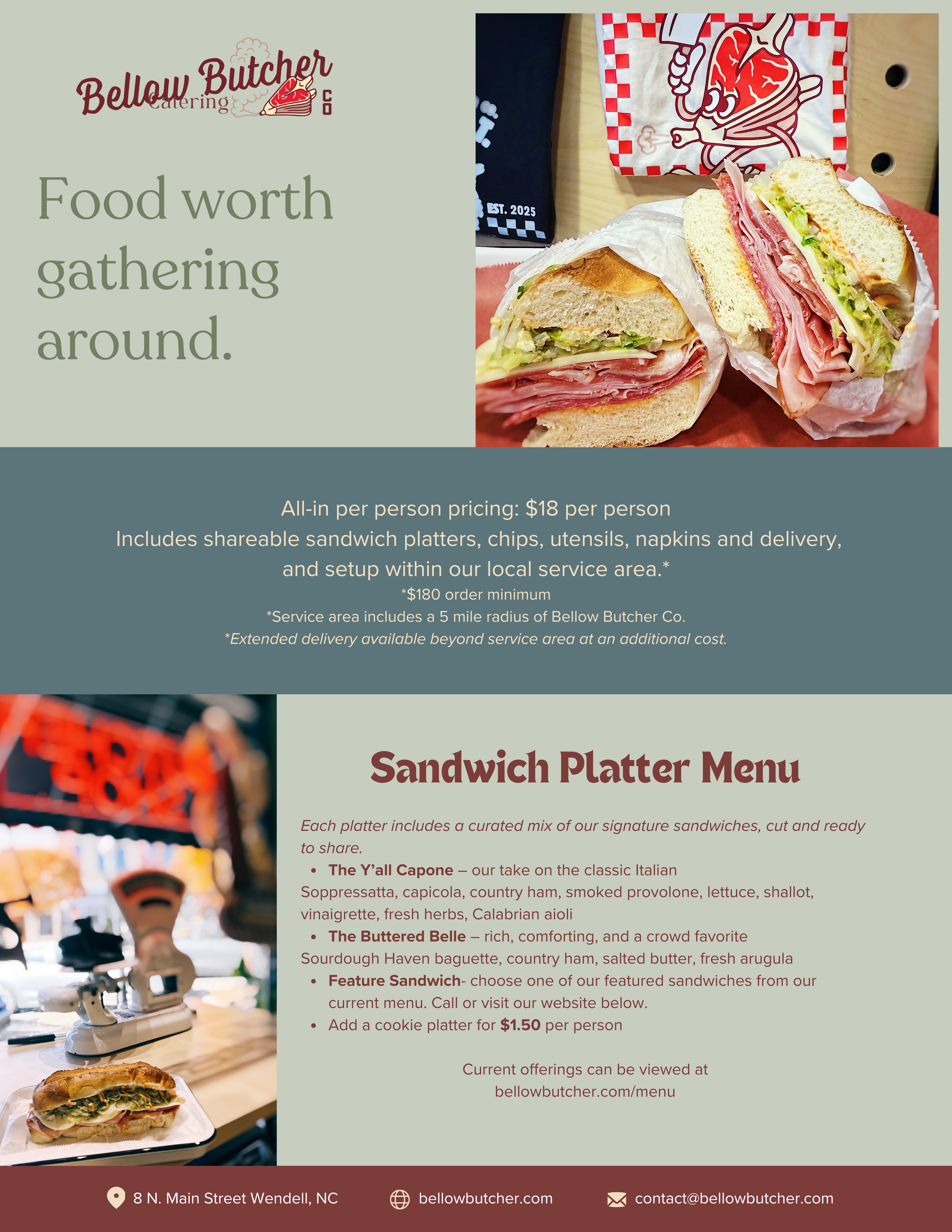 Our Full-Service Sandwich Catering is priced simply at $18 per person for effortless group dining. Each order includes shareable sandwich platters, chips, utensils, napkins, plus delivery and setup within our local service area. A $180 order minimum applies. Service includes locations within a 5-mile radius of Bellow Butcher Co., with extended delivery available beyond that area for an additional fee.